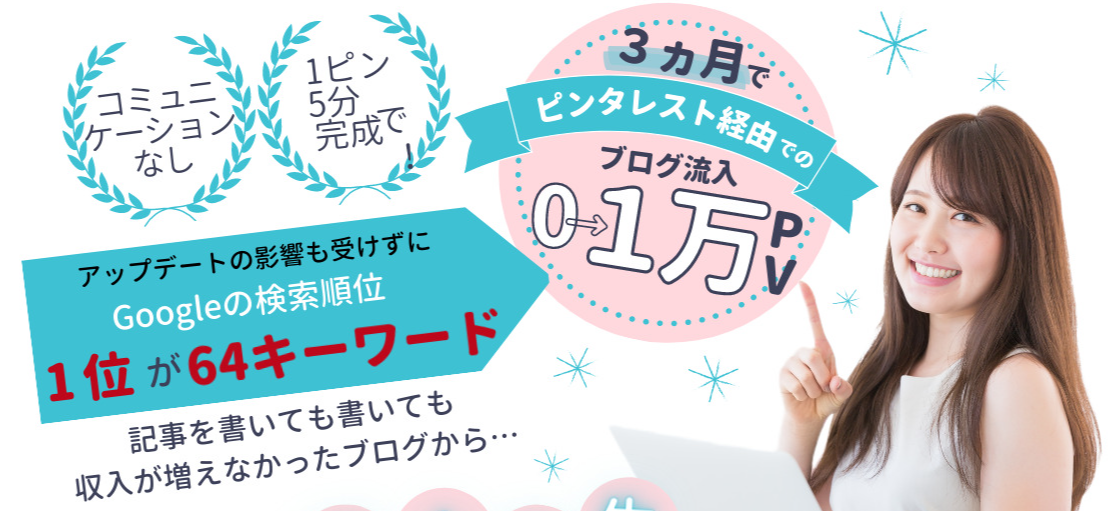 この教材は、「ブログ集客・ブレイクスルー」という名の通り、ブログ流入において90日で1万PVという具体的な実績を達成したピンタレストの運営方法とコツを、惜しみなく公開しています。