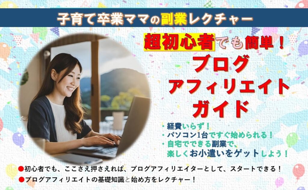 子育てがひと段落したママ必見!自宅で月5万円稼ぐ夢を叶える「超初心者向けブログアフィリエイトガイド」。空いた時間に権利収入を得る方法、記事の書き方、ChatGPT活用法まで、ゼロから始めるあなたを徹底サポートします。全額返金保証付きでリスクなく始められます!
