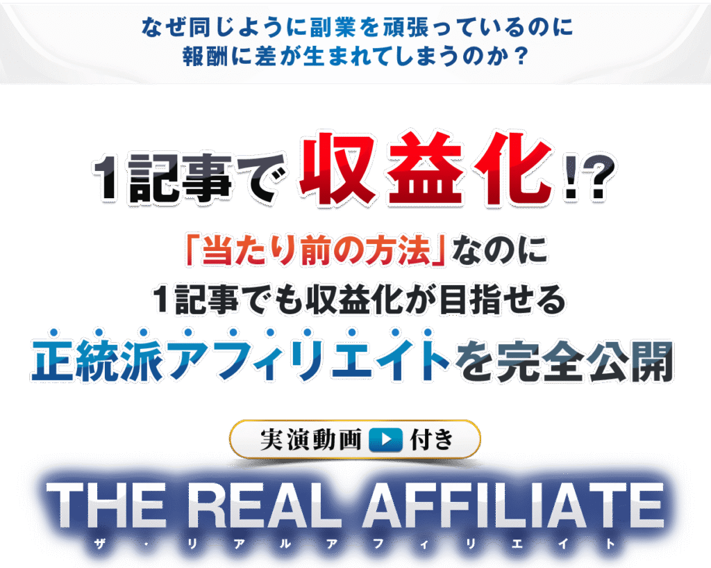 アフィリエイトで成果が出ないあなたへ。1記事で収益化を目指せるサイトアフィリエイト教材「-THE REAL AFFILIATE-」を徹底解説。挫折経験のある初心者も動画で本質的なノウハウを学び、効率的に成果を出す方法を掴みませんか? -
