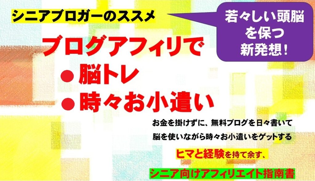70歳ブロガーが贈る、シニア向け脳トレ×お小遣い稼ぎの指南書。認知症予防に効果が期待できるブログアフィリエイトを無料ブログで始め、生きがいと収入を手に入れませんか?初心者でも安心の豪華4大特典と全額返金保証付き。 -