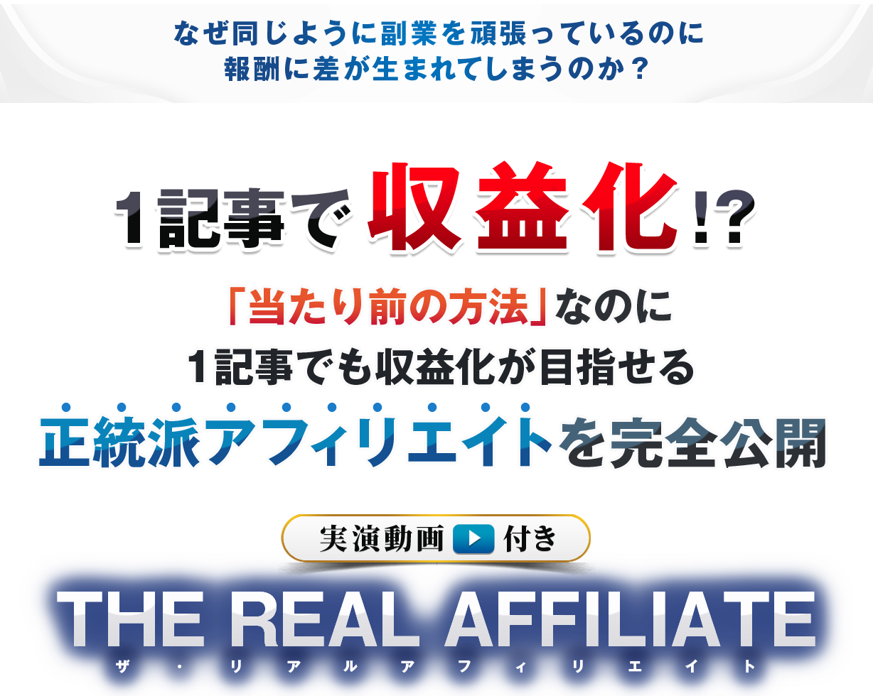 自己流で遠回りしたり、高額な塾に入って結局挫折したりする前に、ぜひ最後までお読みください。今回は、たった1記事で収益化を目指せる画期的なサイトアフィリエイト手法を学べる教材-THE REAL AFFILIATE-を徹底解説します。